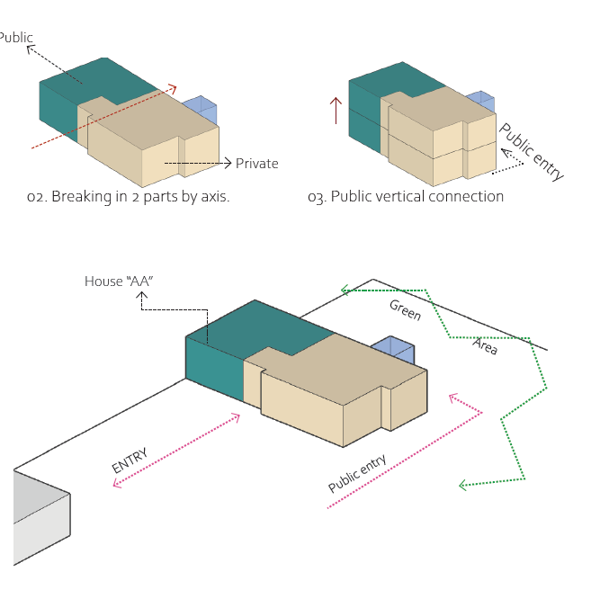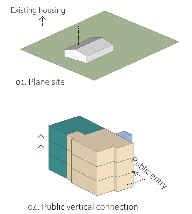 El lugar donde se diseñará el proyecto está cerca de edificios familiares. Para su desarrollo, se consideró el diseño de espacios independientes para los tres propietarios. Por lo tanto, se propone proyectar y construir dos niveles adicionales en el futuro.