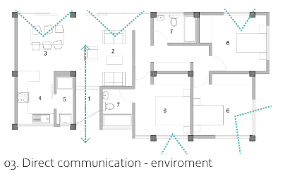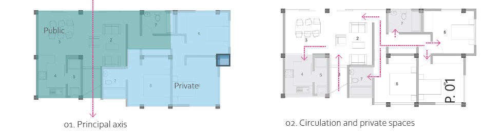 La división del espacio público y privado mediante un eje perpendicular al proyecto. Además, la conexión entre los espacios atendidos y los servidores se destaca a través de un pasillo lateral que actúa como nexo entre el espacio público y el privado. En el espacio público, se prioriza la luz natural, maximizando la sensación de amplitud antes del eje que divide el espacio entre las áreas públicas y privadas.